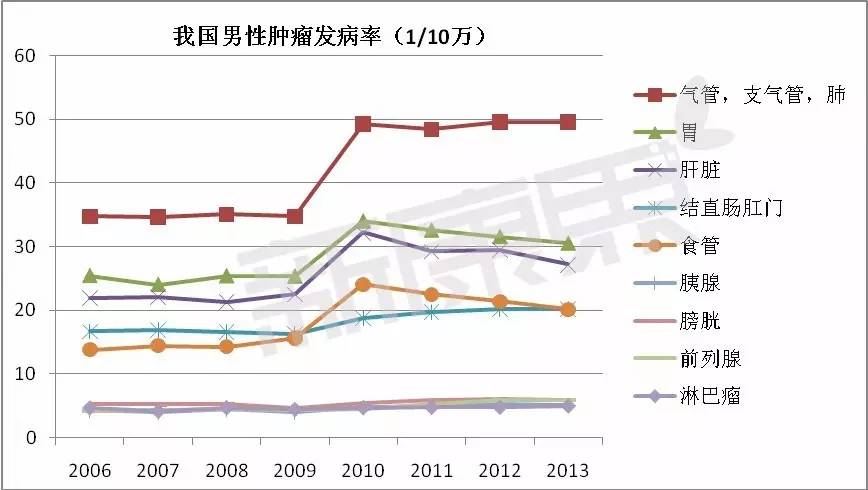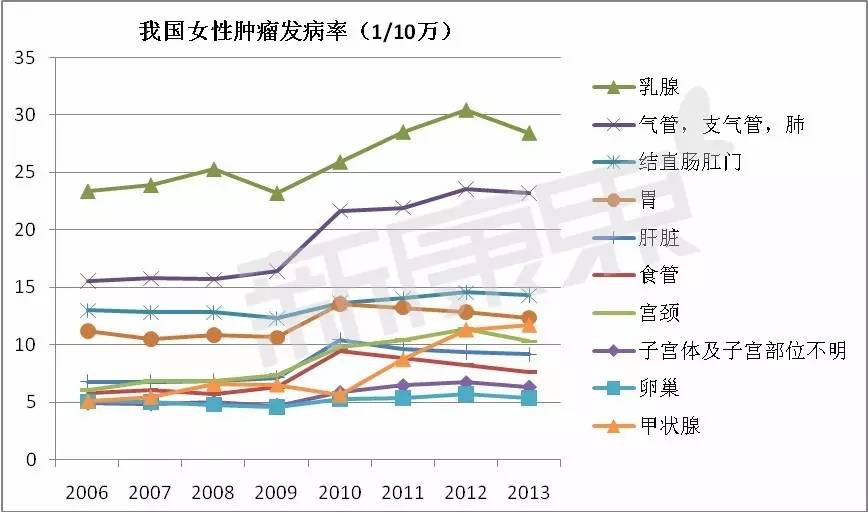 我国男性肿瘤发病率最高的是气管/支气管/肺三大器官,而女性则是最容易发生乳腺癌。