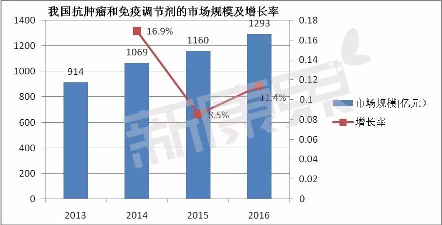 根据中康CMH的数据,我国抗肿瘤和免疫调节剂的市场规模保持快速增长趋势,2016年的市场规模达到1293亿元,较2015年增长了11.4%。