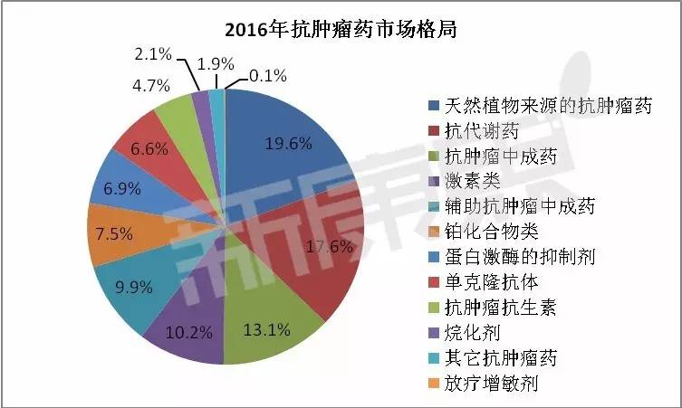 中康CMH的数据显示,在抗肿瘤药中,2016年天然植物来源的抗肿瘤药的市场份额最高,top5类型的抗肿瘤药的市场份额合计占70.4%的市场份额。