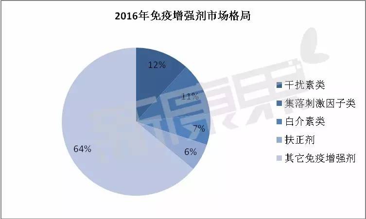 免疫增强剂市场竞争激烈,2016年市场份额最高的干扰素类只占了12%的市场,top4类型的免疫增强剂合计占不到一半的市场份额。