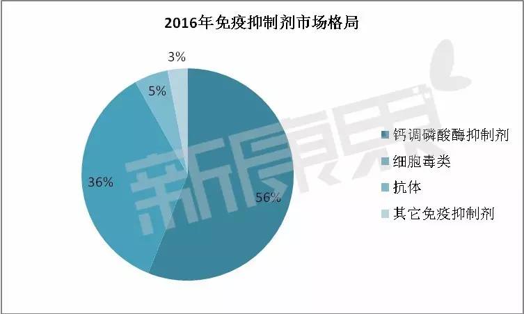 免疫抑制剂主要分为钙调磷酸酶抑制剂、细胞毒类、抗体,其中钙调磷酸酶抑制剂的市场竞争力最强,2016年占了一半的市场,达到56%的市场份额,其次是细胞毒类抑制剂,占了36%的市场份额。