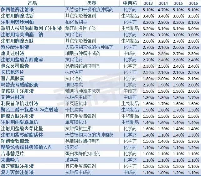 据中康CMH的数据显示,抗肿瘤药和免疫调节剂中2016年市场份额大于1%的产品有27个,其中化学药占大部分,达到16个,其次是生物制品,占7个,中成药占4个。