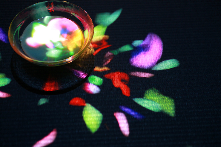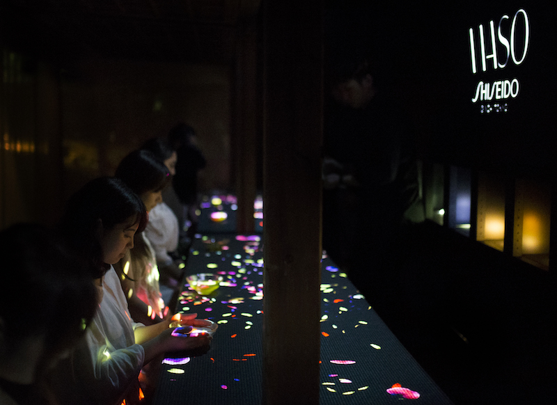 在其中一个茶室项目中,资生堂将7月份刚推出的护肤品牌WASO与作品融合了起来。走进房间,参观者被要求坐成一排,当面前的茶碗里被注入茶水,碗里的花朵便会绽放、移动、扩散。当你把茶喝完,花就会立刻消失。喝茶前,主持人告诉参观者,茶中所包含的人参、枇杷叶、梅、蜂蜜、银耳等成分,都是 WASO中包含的成分。