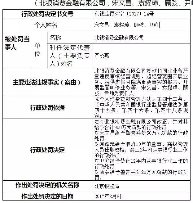 九月初,北京银监局官网就发布了本月第一则900万元的罚款信息公示,北银消费金融有限公司因严重违反审慎经营规则、超经营范围开展业务、提供虚假且隐瞒重要事实的报表、开展监管叫停业务等,于今年8月8日被北京银监局开出合计,同时对宋文昌、袁耀璋、顾弢、尹峥4个相关责任人作出了包括罚款、取消任职、禁止从事银行业工作等在内的行政处罚措施。