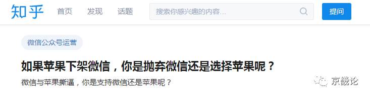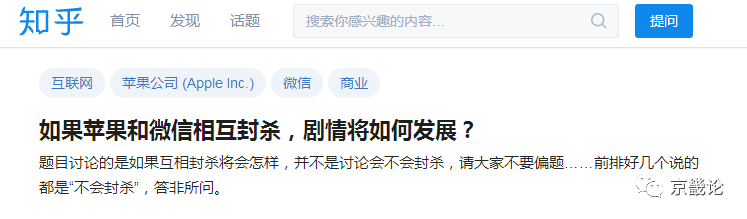 苹果和微信,这两个巨头动辄有啥动作就是一场在中文世界的风波。前几个月因为苹果强制规定打赏抽成30%,结果逼得腾讯只能关闭IOS版微信公众号打赏功能,就在微信和苹果撕的不可开交的时候,对于苹果和微信存在只能二选一的情况吗?苹果要下架微信等问题,中文世界的网民纷纷为自己的支持的公司站队,知乎上甚至有了相关问题,讨论此番互撕会来带来的影响: