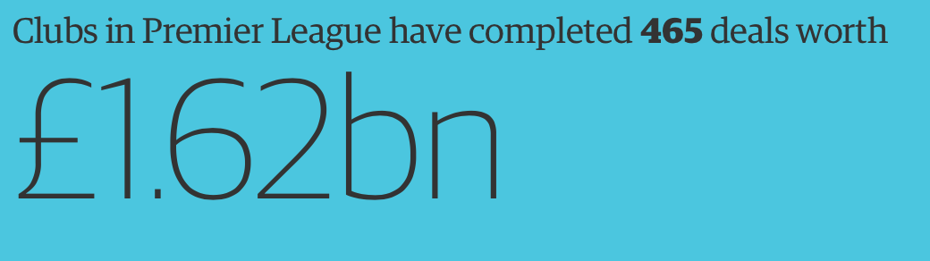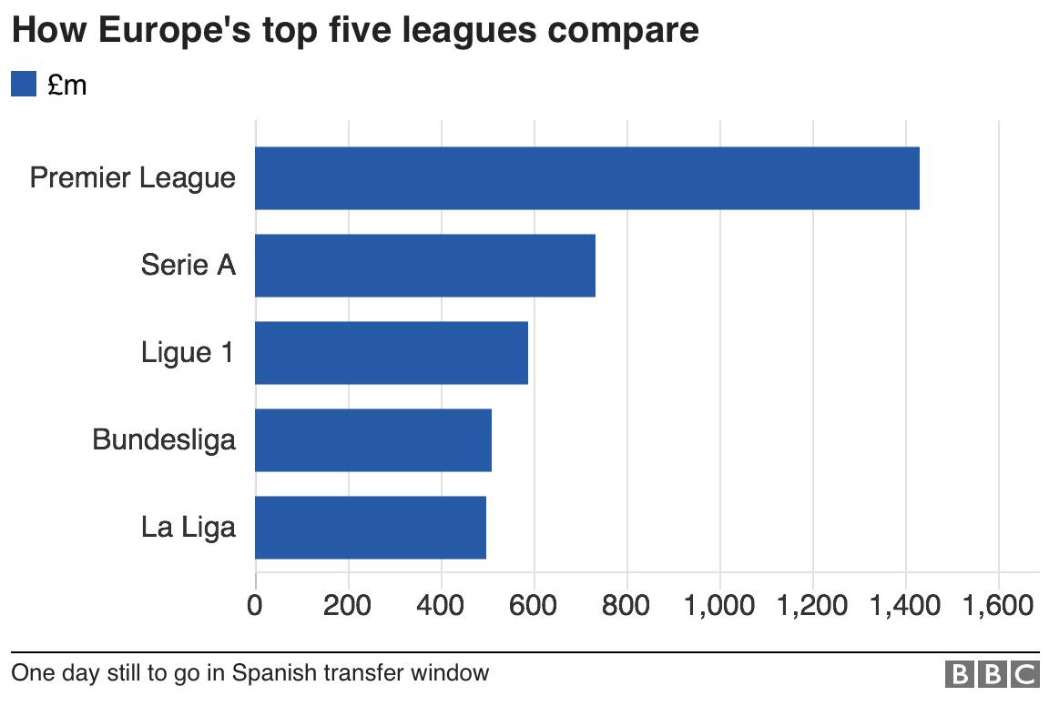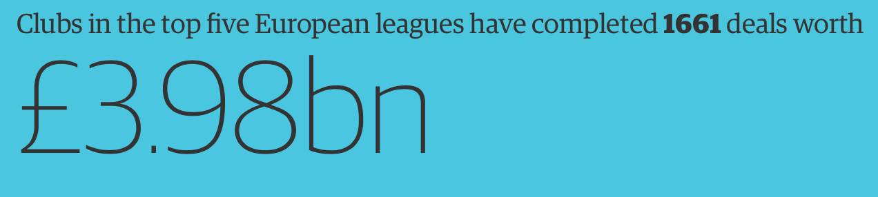 1661 - 欧洲五大联赛今年夏天已经完成了1661宗交易,总价值达到了39.8亿英镑。以成本计算,39.8亿英镑可以造出13架波音747客机,或者拍摄40部刚刚在国内上映的大片《敦刻尔克》。
