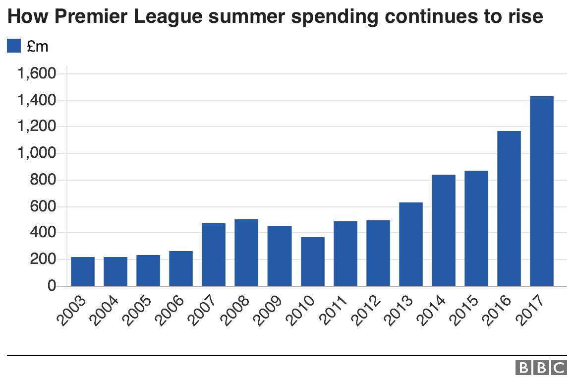 英超新纪录 - 16亿英镑也是英超联赛创下的历史新高,去年夏天刚刚创下的10亿英镑交易额纪录已经作古。自2010年以来,英超的夏季转会窗口每年都在刷新纪录,这无疑得益于英超转播大合同的分红。