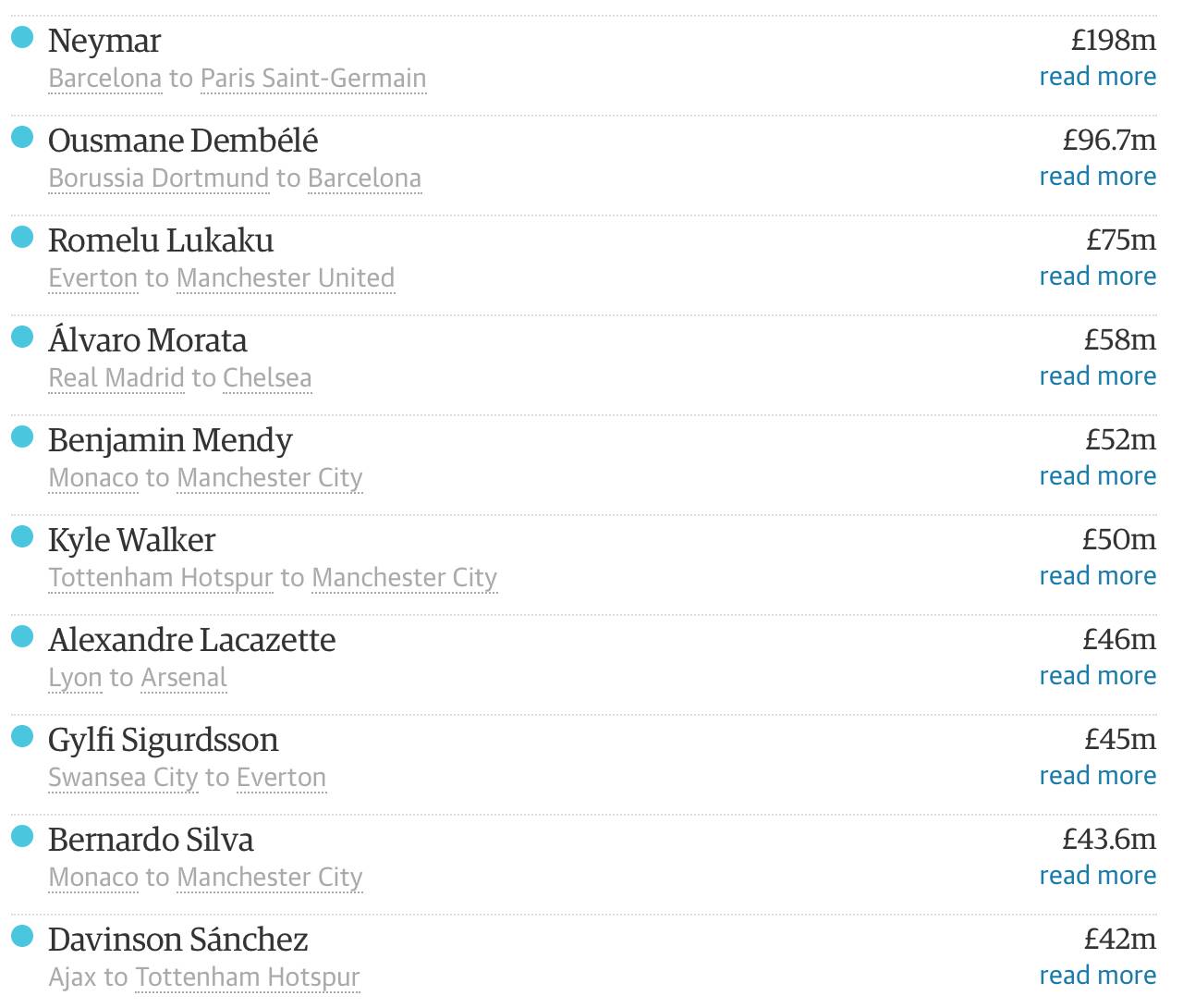 8 - 如前文所说,尽管没有创造标王纪录。但在今年夏天已经达成的最值钱的10笔交易当中,除去内马尔转会巴黎和登贝莱转会巴萨,后八名球员交易全部被英超垄断。紧随内马尔和登贝莱其后的是今年英超的标王卢卡库,他从埃弗顿加盟了曼联,转会身价达到了7500万英镑。
