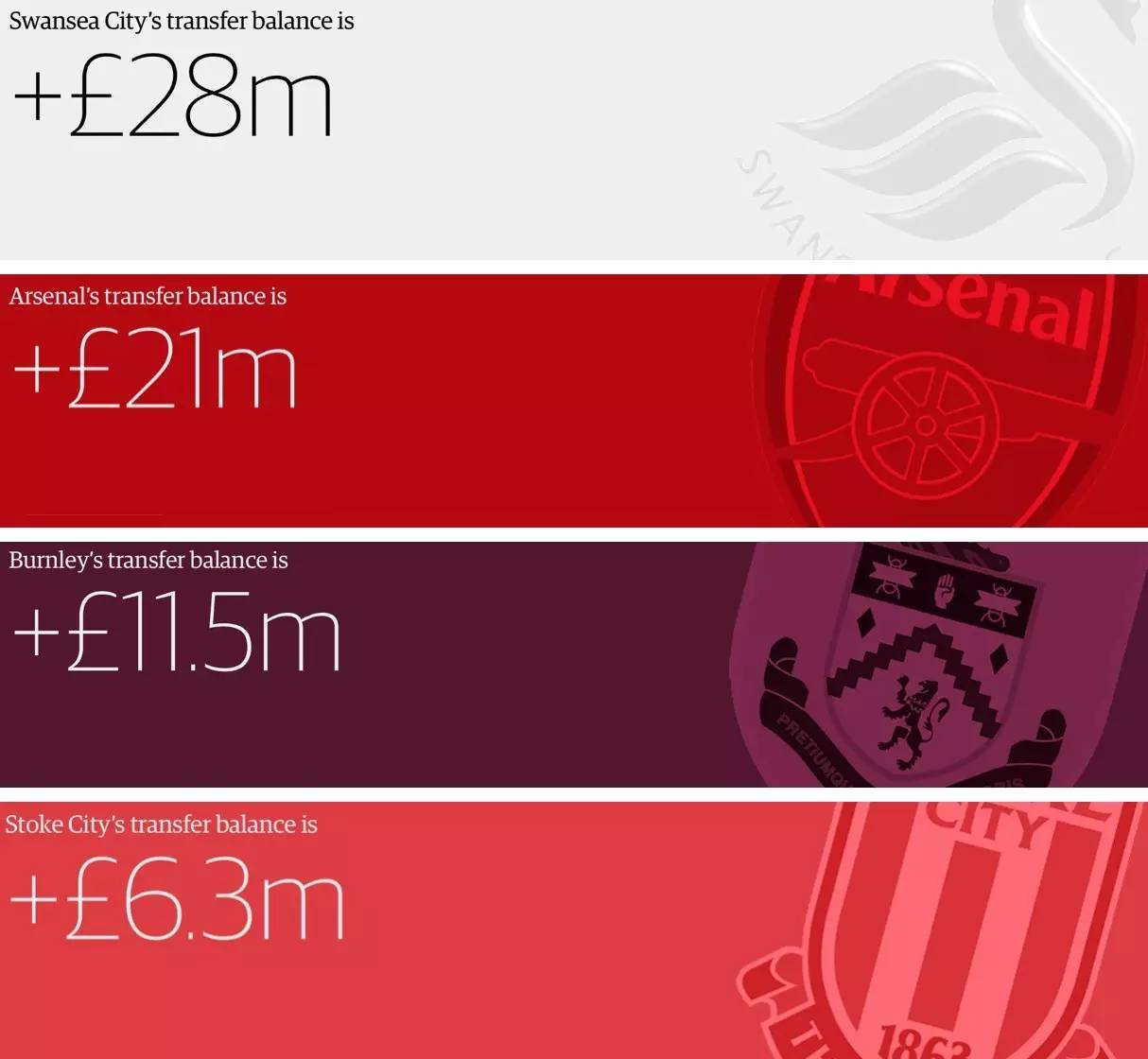 4 - 尽管英超如此疯狂,但仍然有四家俱乐部通过“精打细算”,在整个转会期实现了盈利,这四家俱乐部分别是斯旺西城,伯恩利,斯托克城以及阿森纳。