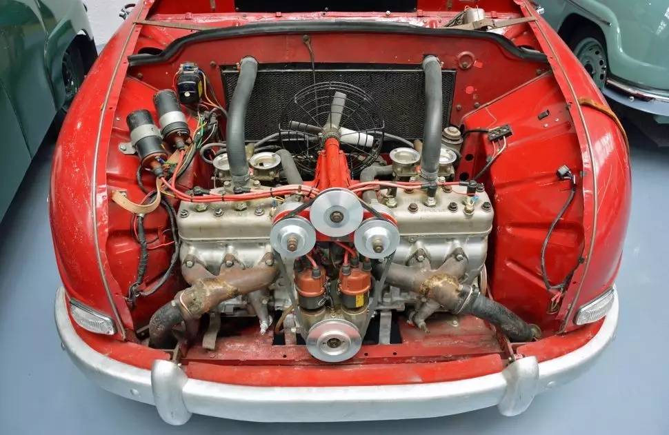 萨博是一家科技树经常点歪的车企(也就他们能想出来用飞机操纵杆代替汽车方向盘的点子,战斗机造得太好也不能这样玩吧),因此对于他们来说弄出来下面这样的杰作也就不足为奇了。萨博当时需要从两冲程引擎压榨出更多动力以便能够在赛场获胜,于是就研发了这台红色的1959年款萨博93实验车。