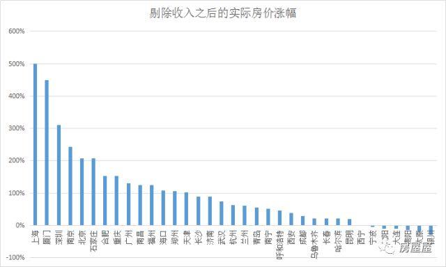 通过简单剔除收入涨幅,可以得到各城市十年房价实际涨幅:
