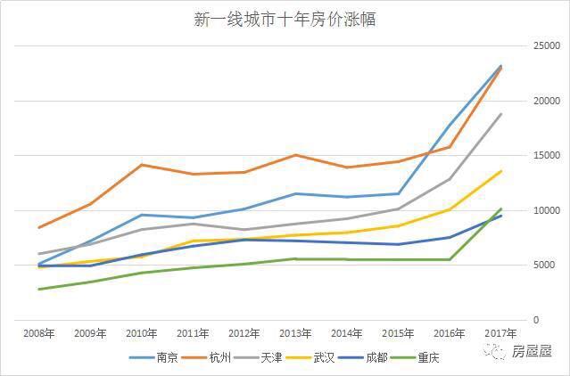 从涨幅上看,南京十年涨幅高达353%,重庆为266%,天津为211%,而杭州、武汉、成都均不到200%。