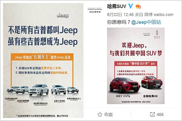 王凤英刚说完,长城就开始和Jeep“眉目传情”。Jeep先是推出“长城车主”圆梦Jeep的活动,长城哈弗又打个擦边球,分享活动并问“你愿意吗?”,引得外界想入非非。