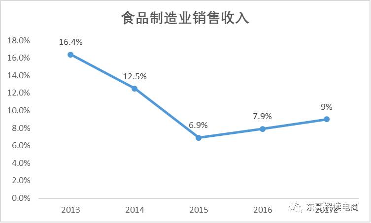 报告显示,由于宏观环境不景气,以及传统食品行业需求上限,食品制造业销售收入自2013年以来陆续下跌,并在2015年达到最低点,随后开始反弹。