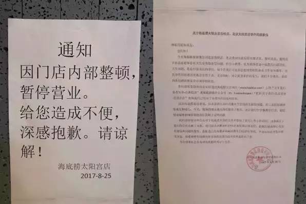 北京海底捞被排查的两个门店已经贴上“暂停营业”的通知。