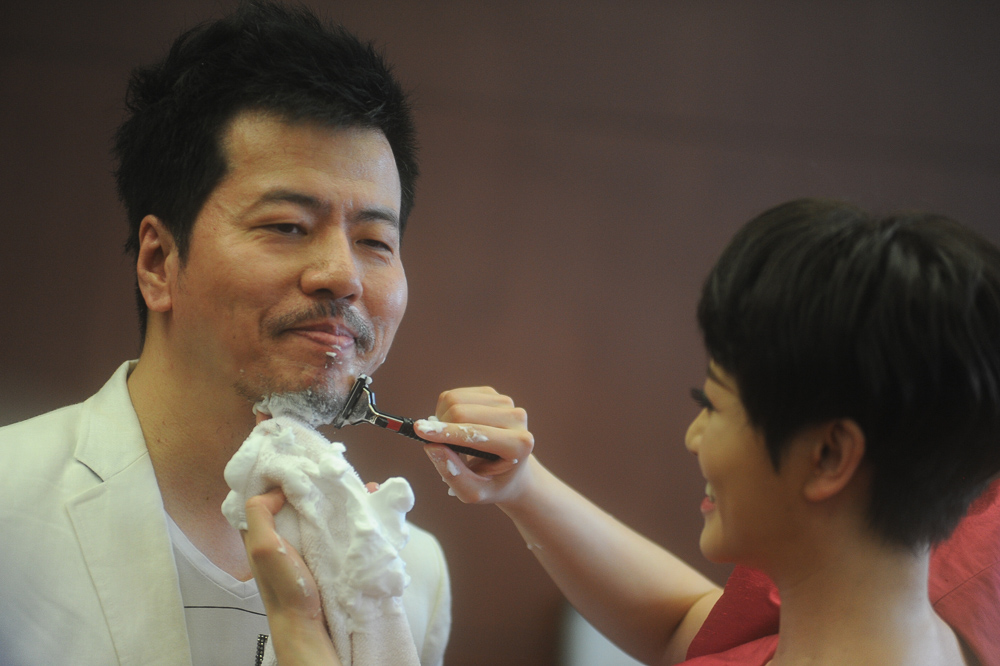 题图:2013年08月,南京,十五年从未剃光过胡子的黄国伦,在主持人妻子寇乃馨的见证下,为了南京亚青会剃光了所有的胡须。用他的话说:“自从谱写了亚青主题曲《让梦想起飞》、《我们的青春》以后,我就想从内到外年轻一次。”