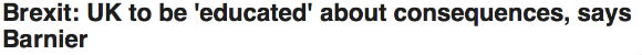 【欧盟代表称英国要为脱欧交学费】欧盟的英国脱欧事务谈判代表迈克·巴尼尔说脱欧的过程是一个机会,“教英国和其他国家的人,离开欧盟意味着什么”。他说这不是诉诸敲诈,这只是他的职责,“教育”英国要为离开欧盟支付代价。