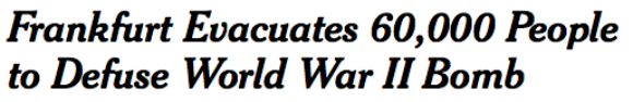 【德国法兰克福拆除二战遗留炸弹】德国法兰克福成千上万人周日暂时逃离了自己的家。一枚重达4000磅的二战时期炸弹于上周二在歌德大学附近建筑工地被发现,据信是当年英国皇家空军投掷的。
