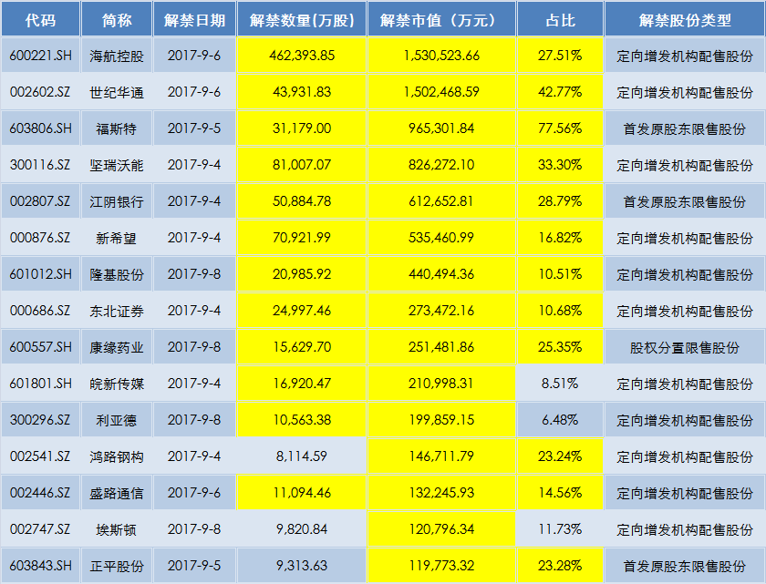 海航控股是本周解禁数量和市值最高的公司。根据公告,公司9月6日有46.24亿股限售股上市流通,占总股本比例为27.51%,以最新股价计算,解禁市值高达153亿元。