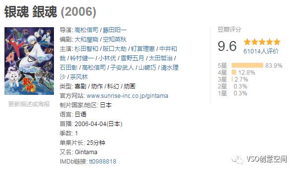 9.6分!!也就是说,看过这部动画的观众,百分之九十五以上都给了满分好评!!在《银魂》漫画连载两年后,2006年4月起,《银魂》动画开始在东京电视台播出,随后,《红樱篇》、《银魂第二季》、《银魂延长战》分别于2010、2011、2012年正式播出,吊儿郎当、爱吃甜食还总是嬉皮笑脸的坂田银时迅速走红并连续多届当选“最吸引女性的二次元动漫角色”。