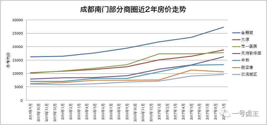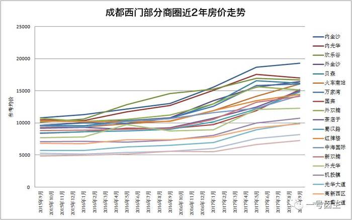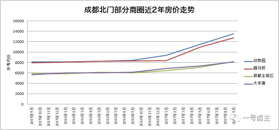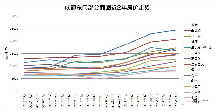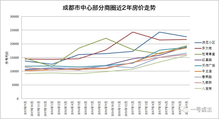 通过综合搜集整理,笔者分别对东西南北中部分商圈近2年的房价走势做个一个对比图,仅供参考: