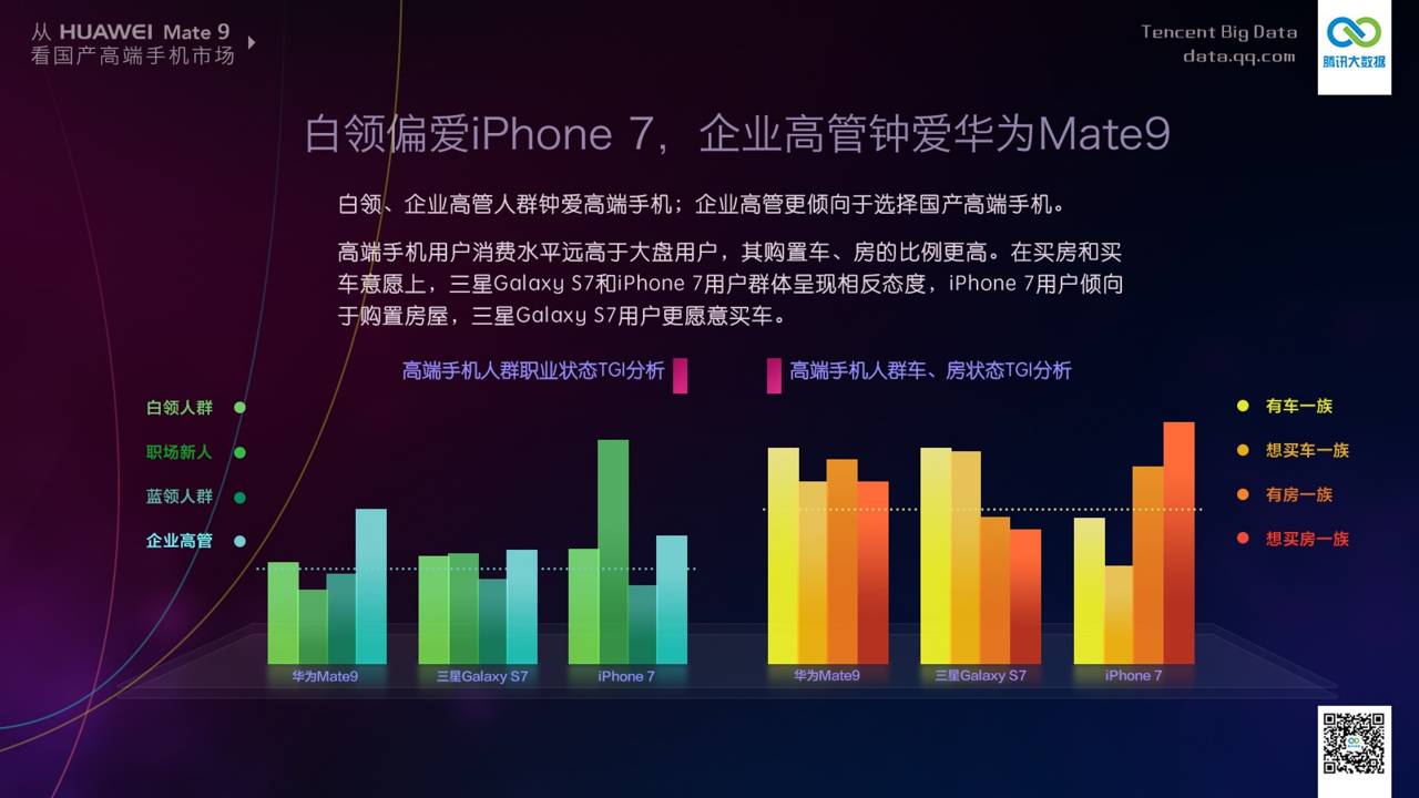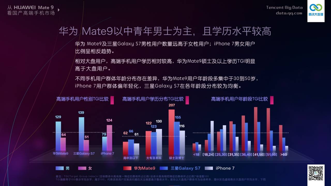 报告指出,在这三部手机的用户调查中,使用华为Mate 9 的用户特征多以中青年男士、高阶主管、高学历、老板等形象为主。腾讯认为,此一族群选择手机时较为理性,多以实用性为主要考量,符合华为一贯的营销模式。