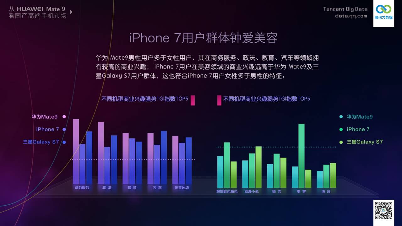 另外据调查显示,华为 Mate 9 的用户多对政法、汽车等领域感兴趣。而iPhone 7 的用户则偏爱美容?