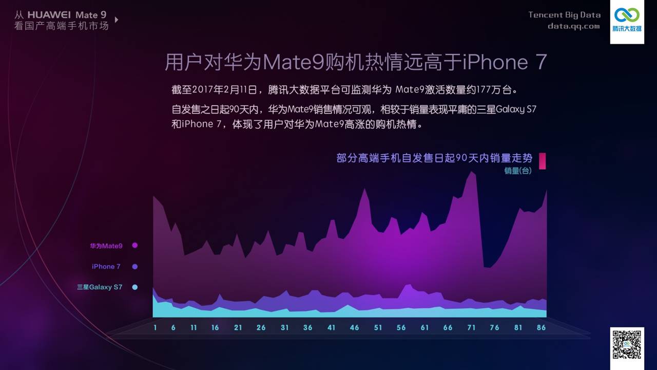 以腾讯这份《从华为Mate9看国产高端手机市场》来看,整份报告没有标明如何做的统计样本,甚至连基本的样本数量也没有给出。不免让这些数据看起来带有广告的成分,但如此过分的「美化」,想必效果会适得其反吧。