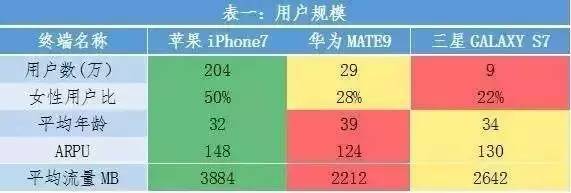 ▲图表为近期浙江移动曝光的一组数据,显示 iPhone7 用户规模近 mate9 用户的 7 倍