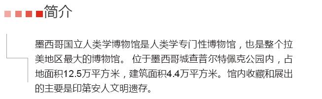 墨西哥人类学博物馆以它独特的富有魅力的藏品在世界博物馆界独树一帜。它的藏品不仅反映了墨西哥,也反映了整个美洲早期文明的进程,第一次向世界人民展示了美洲人民辉煌的历史。参观了这种著名的博物馆,人们惊叹古代美洲人卓越成就的同时,就会抛却长期形成的历史偏见。
