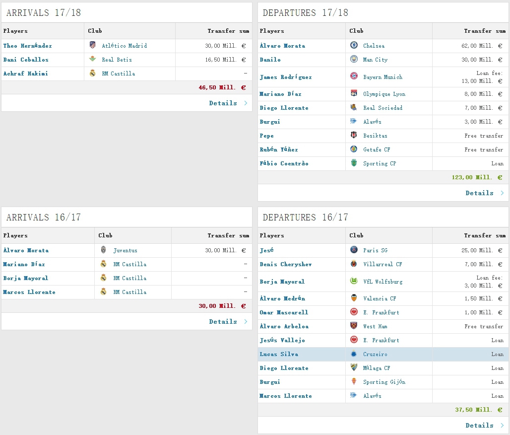 2016-17赛季的两个转会窗口,齐达内只是用3000万欧元将莫拉塔回购(尤文图斯);而今年夏天,他将3000万欧元的特奥·埃尔南德斯(马德里竞技)和1650万欧元的塞巴略斯(皇家贝蒂斯)招至麾下,配以租借回归的巴列霍(法兰克福)、布尔吉(希洪竞技)与马科斯·略伦特(阿拉维斯)。