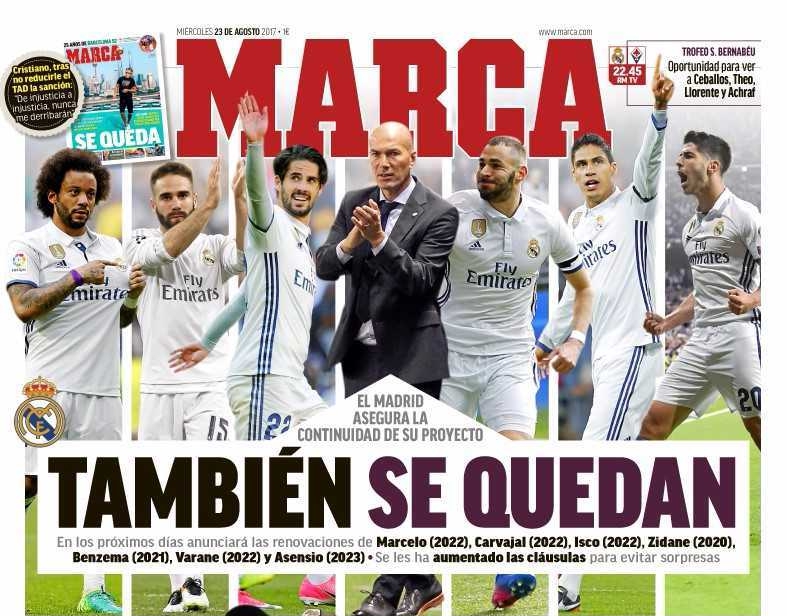 据悉,皇马将先后与包括伊斯科、阿森西奥、本泽马、马塞洛、卡瓦哈尔、瓦拉内在内的6名球员续约。考虑到大巴黎已经以触发违约金条款的方式买下内马尔,皇马也将在新合同中大幅提高球员违约金,伊斯科的违约金可能会达到7亿欧元。此外,球队还在上赛季续约了C罗、贝尔、克罗斯、莫德里奇等主力。