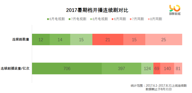 娱影连续剧系统显示,2017年6-8月暑假期间,上线连续剧共102部,产生流量1518亿。其中,电视剧41部,播放量为1227亿,占整体暑期档流量的81%;网络剧61部,播放量为291亿,仅占整体暑期档的19%。从两组数据来看,网剧整体播放量虽与电视剧存在一定差距,但较以往暑期档网络剧,今年的网剧从量到质均有大幅提升,更有一些“小而美”的精致之作发挥长尾效应,实现了四两拨千斤的功效。