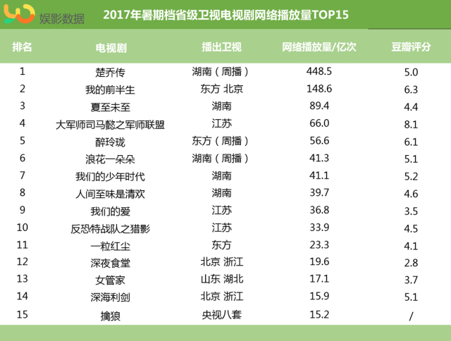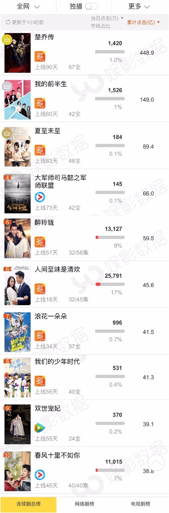 从娱影数据截取3月内上线连续剧的播放量TOP10,可看出剧集市场马太效应明显,TOP10所产生的流量超过整体的66%。头部节目的吸睛能力极强,腰、尾部节目的生存空间被进一步挤压,市场竞争更加激烈。暑期连续剧播放量TOP10中,电视端的《楚乔传》《我的前半生》和网台联动大剧《军师联盟》等均贡献了超高点击量,同时,网络端的古装剧《双世宠妃》与青春题材的《春风十里不如你》也表现不俗。