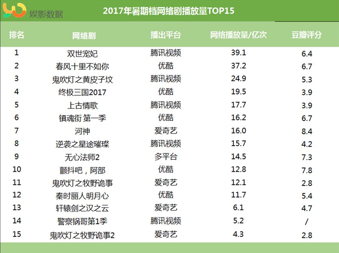 值得一提的是,被称为“高颜值+快节奏+低成本”的网剧《双世宠妃》意外走红,成为暑期档网播量最高的作品。同样以小博大的悬疑剧《河神》打破“大IP、大明星出爆款”的套路,上演了一场华丽逆袭,目前网络点播量突破16亿次,豆瓣评分高达8.4分,堪称今年暑期档网剧最大的黑马。同样在暑假期间播出的《无心法师2》、《颤抖吧,阿部》等作品,均获得了较高的点击率与不错的口碑。