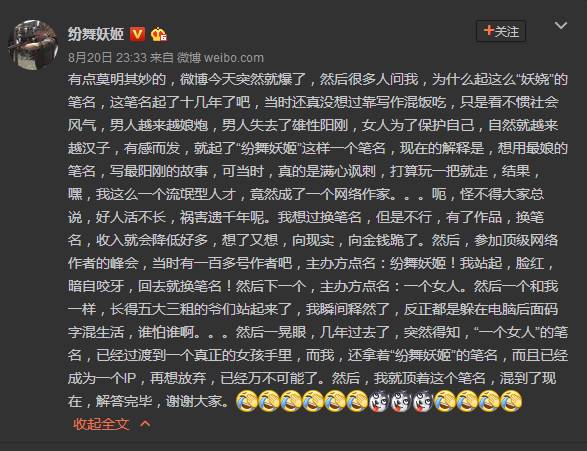 这时候,《战狼2》的编剧董群还真就站出来了,哭笑不得的说了一句:《弹痕》就是我写的。原来《弹痕》发布的时候用的是笔名“纷舞妖姬”。大水冲了龙王庙,董群就是纷舞妖姬,纷舞妖姬就是董群。