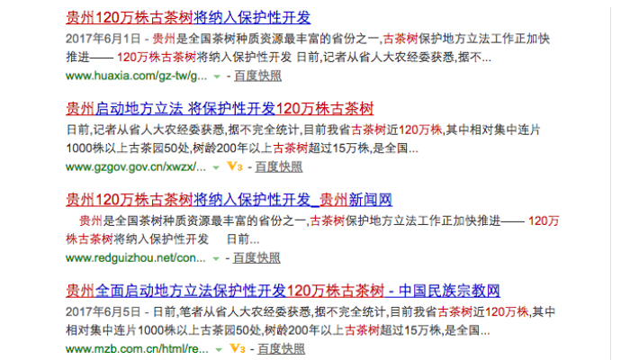 2017年,9月1日,贵州省出台的《古茶树保护条例》正式施行。该条例从法律上给予古茶树明确定义:树龄100年以上的原生地天然生长和栽培型茶树。
