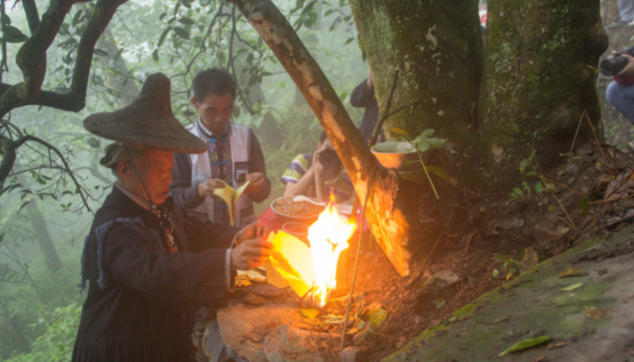 据介绍,相传一千多年前,彝人首领在山林发现一株叶茂芽粗的茶树,取芽嚼之顿感精力旺盛,便将这棵神树郑重保护起来。时至如今,每年开春采茶前,彝族人都会举行祭茶仪式。