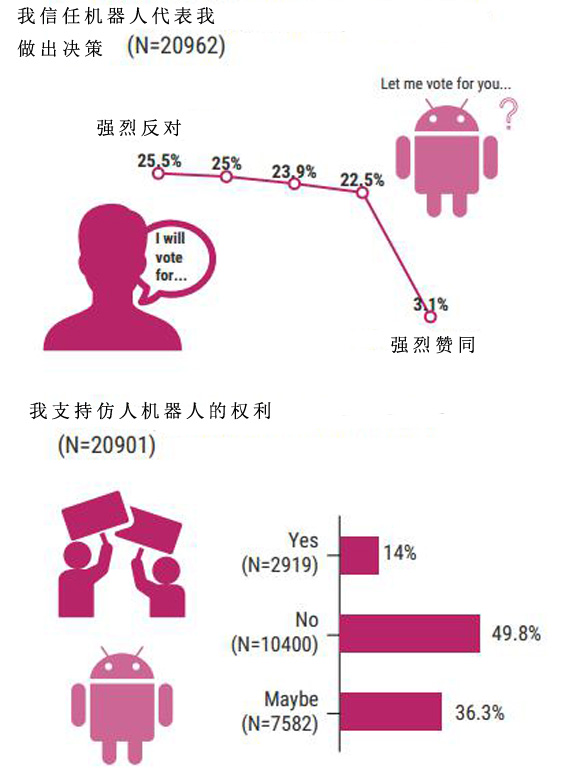 年轻人相信科技能改善生活,并不代表他们就乐意支持某些特定的应用,例如让机器人充当他们的代理人。在接受调查的年轻人中,超过一半表示不会相信由机器人做出的决定,凸显了当代年轻人想要独立自主的意愿。男性比女性接受度还是高一点,男性受访者最多的反应是“某种程度上同意”信任机器人(28.7%),而在女性中,大多数选票的反应是“强烈反对”(30.5%)。