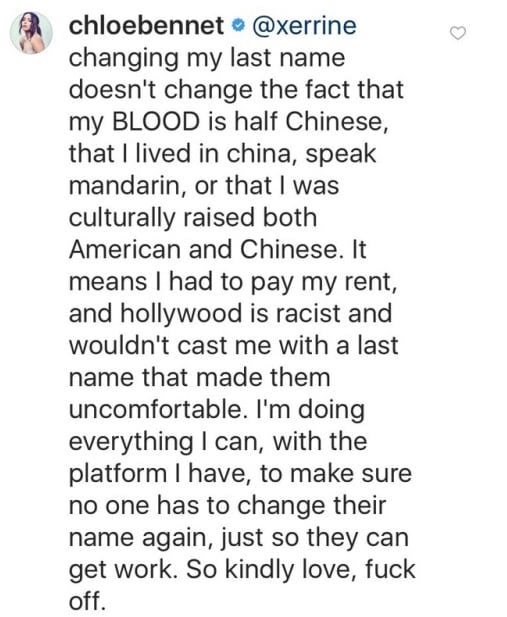 早在三年前她就强调,改名并不是因为她不认可她的亚裔血统,而是因为这个行业的歧视而不得不这样做。2014年在接受the star.com采访时,她说作为Chloe Wang的她,“在线上预定东西都很困难”,好莱坞也不会给她机会,而变成Chloe Bennet没几天,她就拿到了演戏生涯的首个大角色。