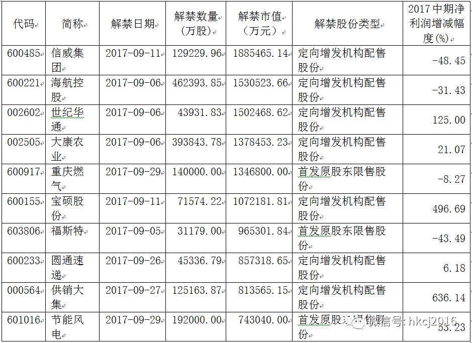 从解禁个股来看,解禁市值超过10亿元的公司有76家,解禁市值超过50亿元的公司有14家,解禁市值超过100亿元的公司也有5家,如9月11日解禁的某公司,解禁股份为12.92亿股,解禁市值为188.55亿元。另外,9月6日也有3家大鳄股出现。其中包括有海航控股,解禁股份为46.24亿股,解禁市值为153.05亿元;世纪华通,解禁股份为4.39亿股,解禁市值为150.25亿元,大康农业,解禁股份为39.38亿股,解禁市值为137.85亿元。再者,9月29日解禁的重庆燃气,解禁股份为14亿股,解禁市值为134.68亿元。9月11日解禁的宝硕股份,解禁股份为7.16亿股,解禁市值为107.22亿元。