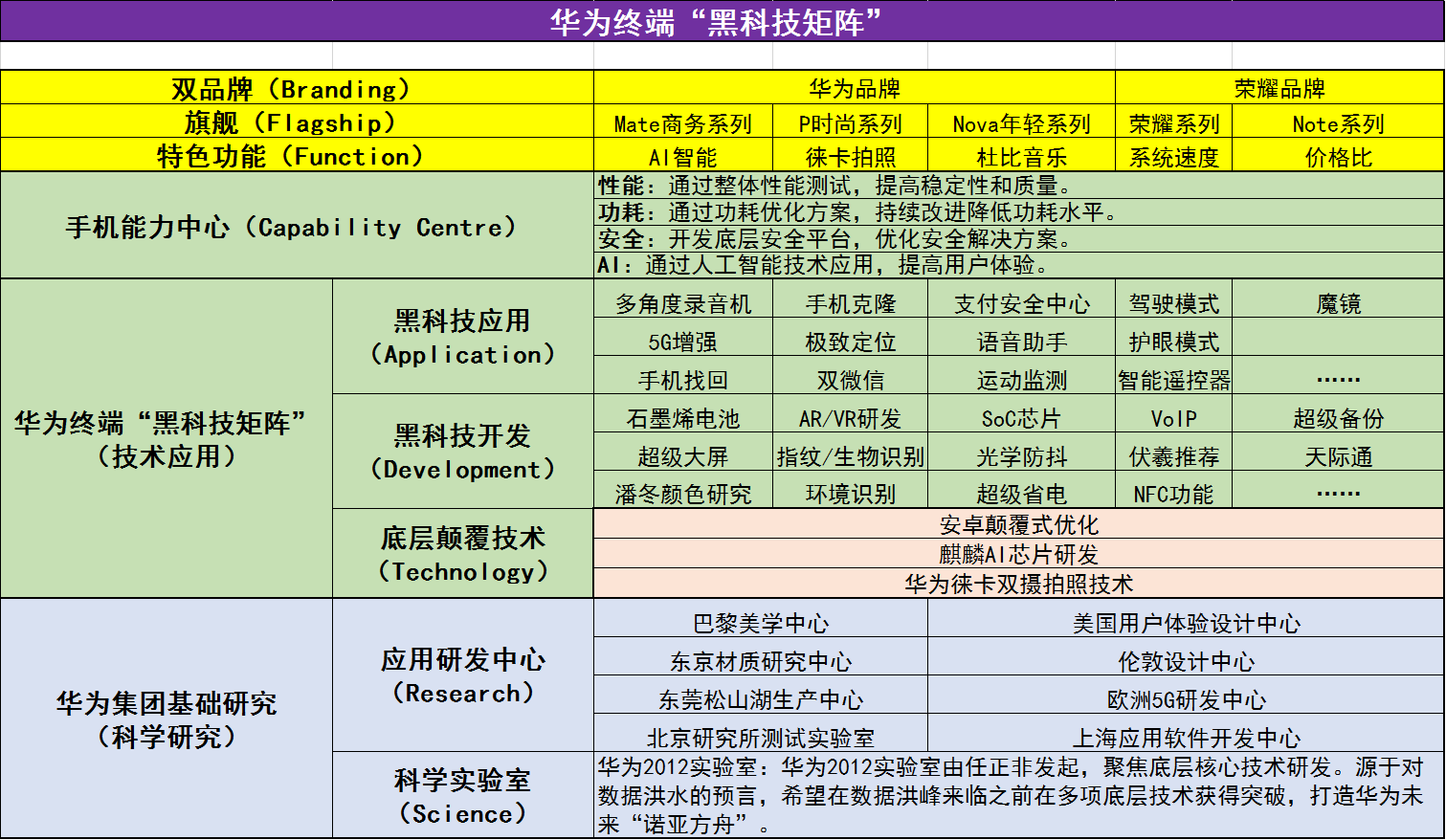 探究起来,华为手机的“黑科技矩阵”传播的最大障碍在于过于严密和专业化,是分层次的研发梯队,科学、技术研发、黑科技应用、能力开发和产品落地实际上是在不同层次上实现。具体而言包括以下几个部分: