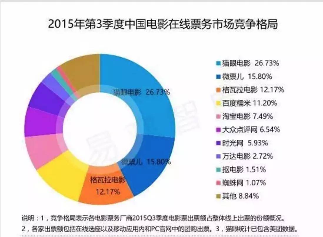 根据易观智库统计易观智库显示,2015年第3季度,中国电影票务市场竞争格局中,猫眼电影、微票儿、格瓦拉电影分别以26.73%、15.80%和12.17%占据中国电影在线票务市场前三位。当微影时代与格瓦拉合并之后,两者市场份额加起来已近28%,超过了一直领跑的猫眼电影。