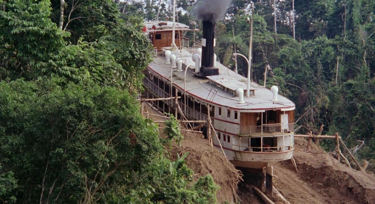 这种接近疯狂的状态很难再现,所以公爵对于现场的把控,其本身也是疯狂的。在拍摄《陆上行舟》现场,片场所在的大船意外撞到了一旁的山体,整座船开始倾斜翻倒,这个时候拍摄还在继续,演员刚好进入最好的状态,于是赫尔佐格用力抱紧快要滑下去的摄影师,坚持录完了这一条。他们在身临其境的地方拍着电影,本来就足够让人陷入迷幻情形,整个剧组也许在那时刻都处于癫狂之中。