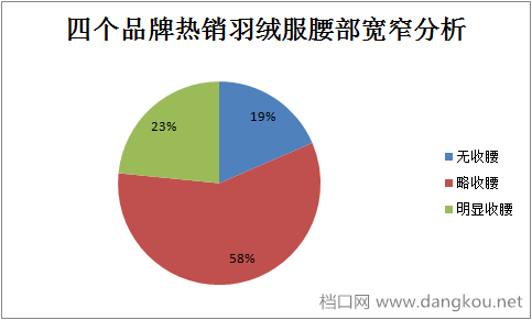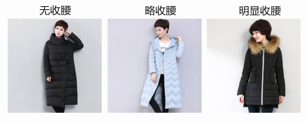 羽绒服腰部宽窄主要体现在:无收腰、明显收腰、略收腰三个方面,实际设计过程中大部分羽绒服看起来都不是特别收腰。