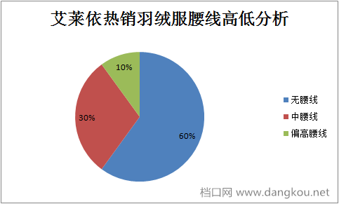 艾莱依品牌热销女士羽绒服的腰线高度处理情况中,无腰线设计占比60%,较平均水平低。中腰线设计占比30%,较平均水平略高。另外该品牌女士羽绒服对于偏高腰线的应用较整体平均值也有所增加。