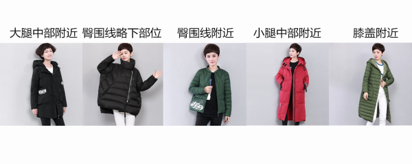 羽绒服的下摆位置主要体现在:大腿中部附近、臀围线略下部位、臀围线附近、小腿中部附近、膝盖附近,大部分羽绒服还是会选择大腿中部附近的下摆位置。