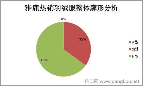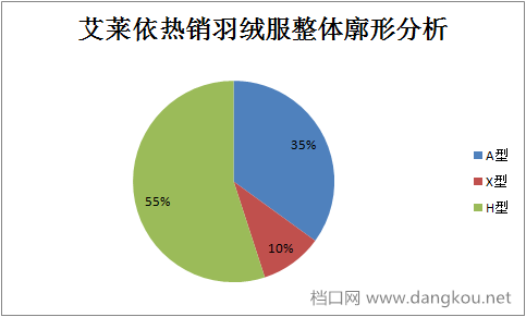 由上图数据分析显示:艾莱依在偏重H型羽绒服外轮廓开发的同时,相应的加大了A型羽绒服廓形的产品开发。