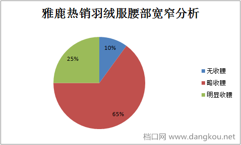 雅鹿品牌热销女士羽绒服在腰部宽窄设计方面所体现的情况与波司登大致相同,只是在略微缩小无收腰型羽绒服开发的同时,更加偏重略收腰型的女士羽绒服款式的开发设计。
