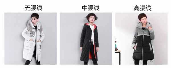 羽绒服腰线高低主要体现在:无腰线、中腰线、偏高腰线三个方面,实际设计过程中大部分羽绒服看起来都是无腰线。